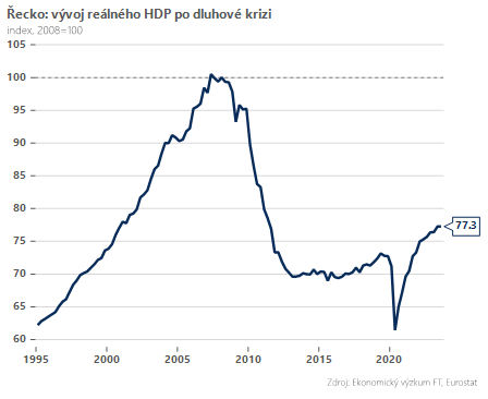 – původně byl totiž řecký příběh akcentován především odpůrci přijetí eura jako odstrašující příklad, komentuje Dominik Rusinko, analytik ČSOB.Jaká jsou fakta? Řecká ekonomika vyrostla od začátku pandemie přibližně o 6 %, což ji řadí k lepší polovině v rámci Evropské unie, nikoli však premiantům. K těm ale Řecko patří v případě tempa redukce veřejného zadlužení. Za poslední tři roky klesl řecký veřejný dluh vůči HDP z 210 % na 167 %, zásluhou vysokého nominálního růstu HDP, ale také relativně rozumné rozpočtové politice. I proto získal řecký dluh opětovně investiční rating, byť je nadále s přehledem nejvyšší v celé EU.