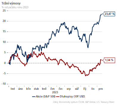 Na druhé straně se daří také dluhopisům – v posledních dvou měsících došlo k razantnímu přecenění a výnos amerického desetiletého papíru klesl o více než 100 bazických bodů pod 4 %. V souhrnu za celý letošní rok se tak již výnosy amerických dlouhých dluhopisů ocitají v pozitivním pásmu, píše v komentáři Dominik Rusinko, analytik ČSOB.