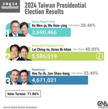 Letošní vítěz Lai získal 5586019 hlasů, což představuje 40% a ztrátu pro DPP nějakých 2,5 milionu hlasů (tedy cca třetiny) oproti minulým volbám. Jeho protikandidát z KMT dostal 4671021 hlasů, což je 33,5% (a ztráta pro KMT cca 15% oproti minule). Třetí kandidát z opoziční strany TPP dostal 3690466 hlasů, tj. 26,46%. Dohromady tedy opoziční kandidáti pobrali 60% hlasů a ukazuje se, jakou strategickou chybou bylo, že KMT a TPP neuzavřely předvolební koalici (o té se na podzim jednalo, ale nakonec bez výsledku) - dnes mohly mít prezidenta i viceprezidenta.