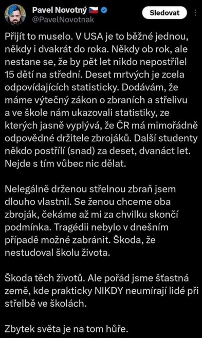 Považuji za skutečně nechutné, pokud člověk, jenž patří mezi hlavní iniciátory této celospolečenské atmosféry, publikoval následně naprosto cynický komentář, jenž je hluboce necitlivý zejména vůči rodinám obětí včerejší tragédie. Napsat ve včerejší den, že u nás lidé při takových útocích "prakticky nikdy neumírají", je za mě ukázka absolutní ztráty jakékoliv empatie vůči pozůstalým, jakož i sebereflexe ve vztahu k vlastním nenávistným výrokům. Naprosté lidské dno.